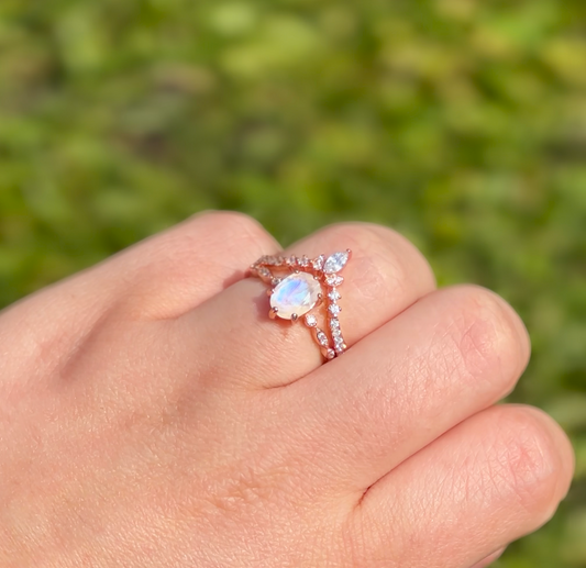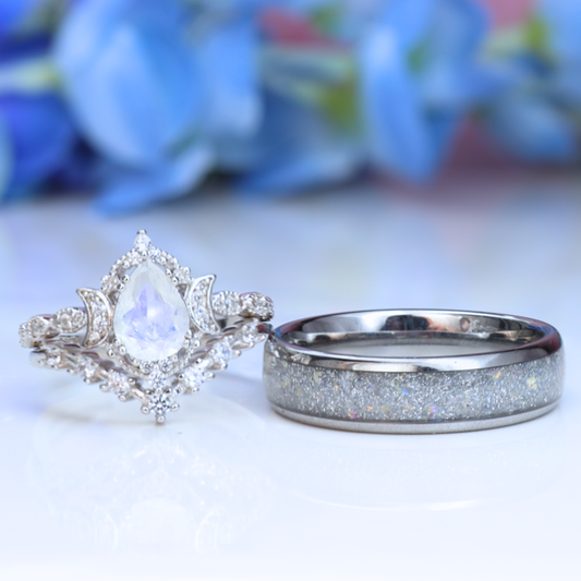 Rainbow Moonstone Silver Tungsten Couples Ring Set